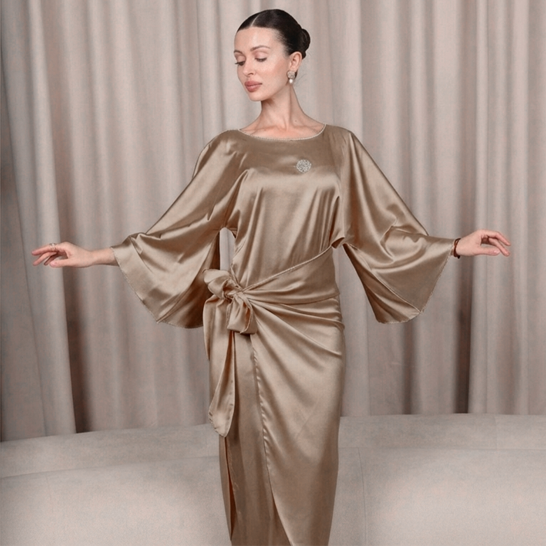 فستان ساتان فاخر مكوّن من قطعتين، يجمع بين الأناقة الراقية والأنوثة الهادئة. الجزء العلوي يتميز بأكمام واسعة بقصّة انسيابية تمنح حركة مريحة وشكلًا جذابًا، بينما تأتي القطعة السفلية بربطة جانبية كبيرة عند الخصر تضيف لمسة فاخرة وتبرز جمال القوام.